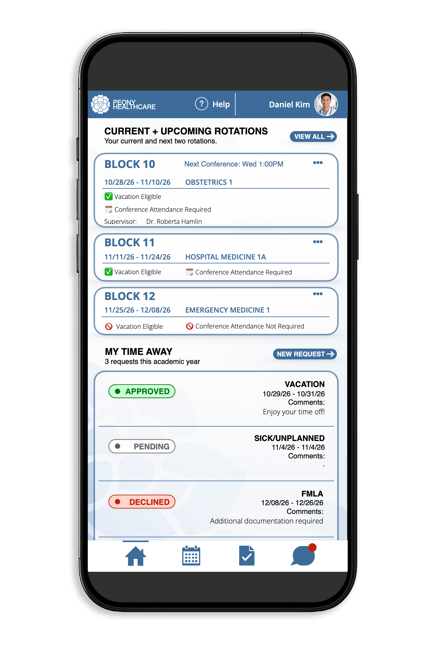 A single, reliable place for residents to see what matters—schedules, time away, conferences, and requirements—structured around a centralized data source.